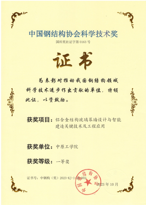 我院教师惠存作为第一完成人,联合陕西省建筑科学研究院有限公司、清华大学等单位,共同完成的“铝合金结构玻璃幕墙设计与智能建造关键技术及工程应用”荣获中国钢结构协会科学技术一等奖。
